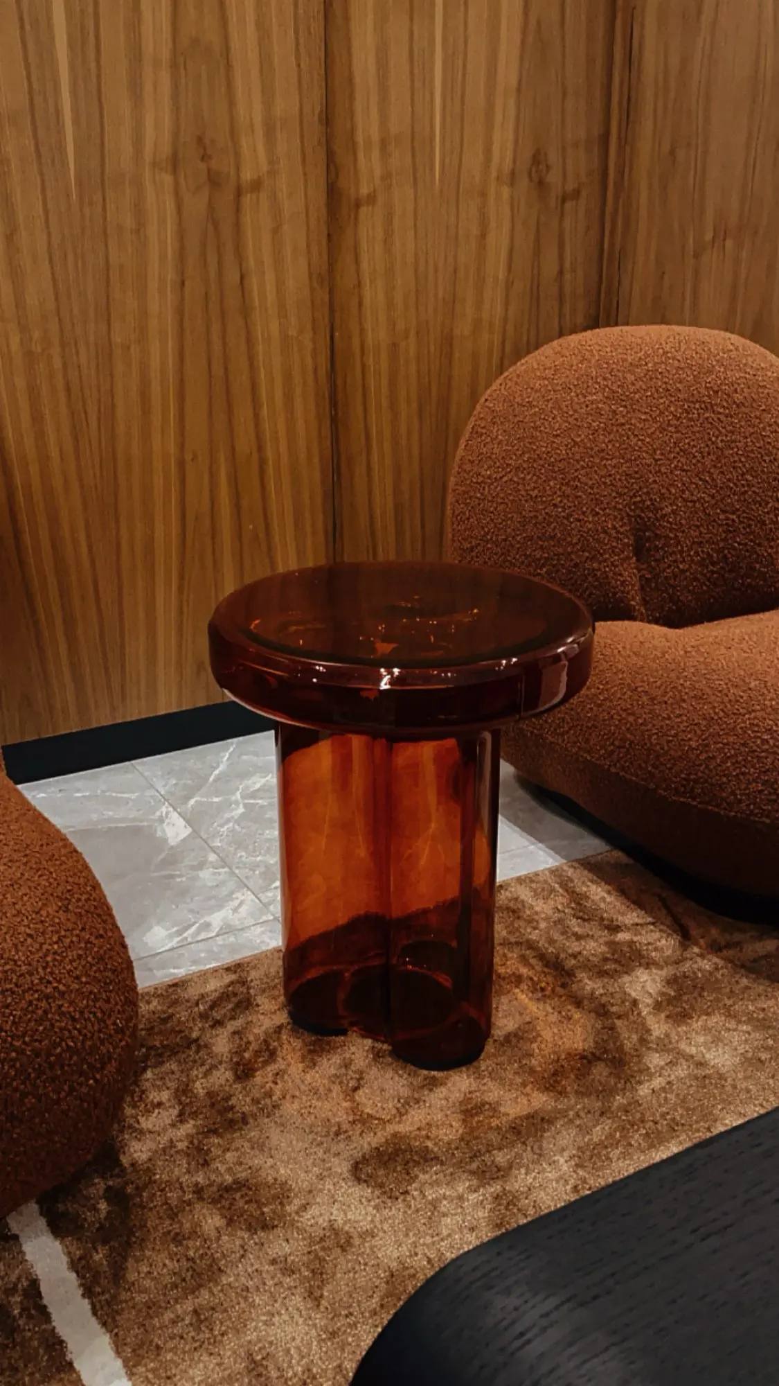 No es tu mesa auxiliar de siempre. Esta mesa de vidrio ámbar soplado a mano es una pieza atrevida, escultural y con un estilo único. Su base en forma de pétalos y su superficie texturizada proyectan sombras envolventes y una luz cálida que transforma cualquier espacio.