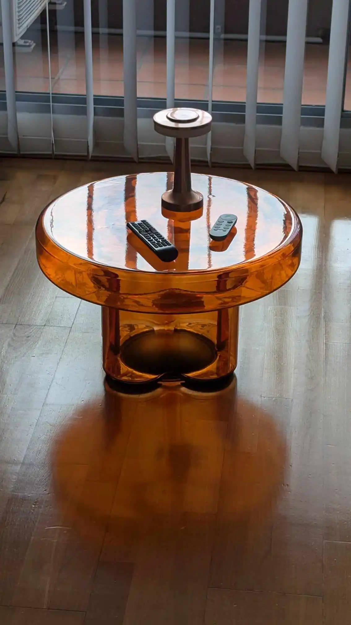 Artistic handblown orange glass side table in warm amber tones, versatile enough for use as a coffee table or stylish bedside piece